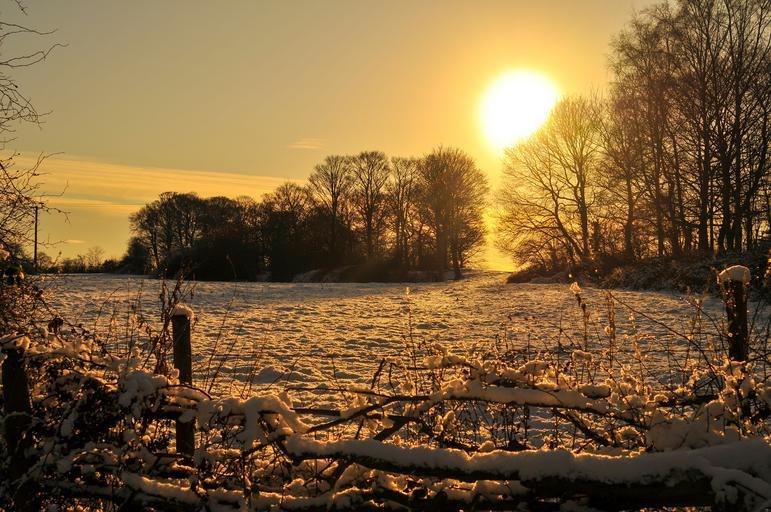 Keywords: golden sun scene snow landscape trees fence meadow sunlight backlight tranquil winter