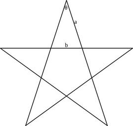 | Keywords: Golden-triangles-pentagram.svg Pentagram with the vertex angle of <math>\theta \cos -1 \left \varphi \over 2 \right 36 \circ</math> where <math>\varphi</math> is the golden ratio In the diagram <math>a \approx 161 8</math> and <math>b 100</math> 2012-12-19 11 01 59 own Krishnavedala validSVG HandSVG cc-zero Uploaded with UploadWizard Golden triangles Pentagrams |