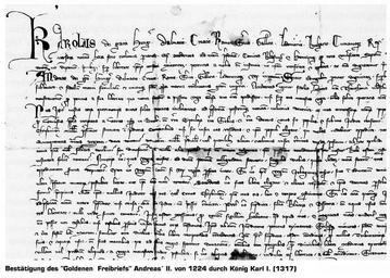 | Keywords: Goldener freibrief 1224.jpg en Acknowledgment of the Golden Charter of the Hungarian king Andrew II by king Charles I of Hungary in 1317 facsimile de Bestätigung des vom ungarischen König Andreas II 1224 erlassenen 'Goldenen Freibriefs' Andreanum durch König Karl I im Jahr 1317 Faksimile http //www sbs-stiftung de/sbs html Siebenbürgisch-Sächsische Stiftung date - abfotografiertes Orginal ist ein Faksimilie einer Urkunde von 1317 Dieses Bild ist die Fotografie eines Faksimilie einer Urkunde von 1317 Goldener Freibrief PD-Art Transylvanian Saxons Deeds 1224 documents 1317 documents Charters from Hungary |