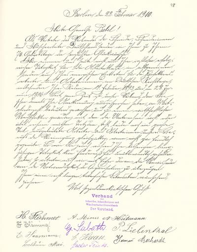 | Keywords: Goldenes Buch zum 70. Geburtstag August Bebel 1910 Seite 098.jpg Goldenes Buch zum 70 Geburtstag August Bebel 1910 Seite_ jpg 097 099 Glückwunschschreiben zum 70 Geburtstag von August Bebel Vorstand des Verbandes der Schneider Schneiderinnen und Wäschearbeiter Deutschlands August Bebel zum siebzigsten Geburtstag 22 Februar 1910 / mit einer Nachbemerkung von Ursula Herrmann Reprint des Unikats aus dem Zentralen Parteiarchiv der SED Dietz Verlag Berlin 1989 Lizenzausgabe Saur 1989 ISBN 3-598-07256-2 self scanned from own book 1910 Diverse PD-old-70-1923 Goldenes Buch zum 70 Geburtstag August Bebel 1910 |