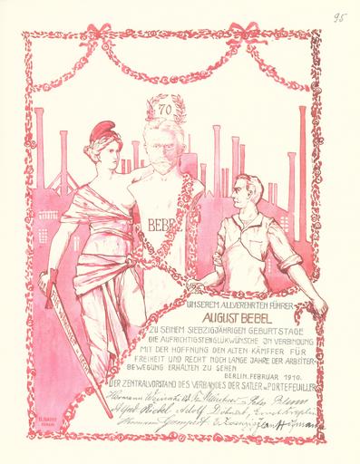 | Keywords: Goldenes Buch zum 70. Geburtstag August Bebel 1910 Seite 095.jpg  Goldenes Buch zum 70 Geburtstag August Bebel 1910 Seite_ jpg 094 096 Glückwunschschreiben zum 70 Geburtstag von August Bebel Zentralvorstand des Verbandes der Sattler und Portefeuiller August Bebel zum siebzigsten Geburtstag 22 Februar 1910 / mit einer Nachbemerkung von Ursula Herrmann Reprint des Unikats aus dem Zentralen Parteiarchiv der SED Dietz Verlag Berlin 1989 Lizenzausgabe Saur 1989 ISBN 3-598-07256-2 self scanned from own book 1910 Diverse PD-old-70-1923 Goldenes Buch zum 70 Geburtstag August Bebel 1910 |