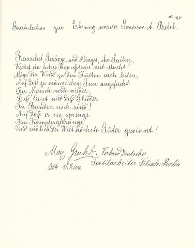 | Keywords: Goldenes Buch zum 70. Geburtstag August Bebel 1910 Seite 160.jpg Goldenes Buch zum 70 Geburtstag August Bebel 1910 Seite_ jpg 159 161 Glückwunschschreiben zum 70 Geburtstag von August Bebel Verband deutscher Textilarbeiter Filiale Berlin August Bebel zum siebzigsten Geburtstag 22 Februar 1910 / mit einer Nachbemerkung von Ursula Herrmann Reprint des Unikats aus dem Zentralen Parteiarchiv der SED Dietz Verlag Berlin 1989 Lizenzausgabe Saur 1989 ISBN 3-598-07256-2 self scanned from own book 1910 Diverse PD-old-70-1923 Goldenes Buch zum 70 Geburtstag August Bebel 1910 |