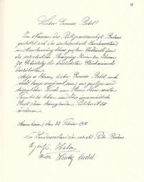 | Keywords: Goldenes Buch zum 70. Geburtstag August Bebel 1910 Seite 038.jpg Goldenes Buch zum 70 Geburtstag August Bebel 1910 Seite_ jpg 037 039 Glückwunschschreiben zum 70 Geburtstag von August Bebel SPD-Landesvorstand Baden August Bebel zum siebzigsten Geburtstag 22 Februar 1910 / mit einer Nachbemerkung von Ursula Herrmann Reprint des Unikats aus dem Zentralen Parteiarchiv der SED Dietz Verlag Berlin 1989 Lizenzausgabe Saur 1989 ISBN 3-598-07256-2 self scanned from own book 1910 Diverse Goldenes Buch zum 70 Geburtstag August Bebel 1910 PD-old-70-1923 |