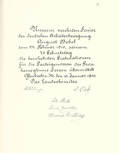 | Keywords: Goldenes Buch zum 70. Geburtstag August Bebel 1910 Seite 039.jpg Goldenes Buch zum 70 Geburtstag August Bebel 1910 Seite_ jpg 038 040 Glückwunschschreiben zum 70 Geburtstag von August Bebel SPD-Landeskomitee Hessen August Bebel zum siebzigsten Geburtstag 22 Februar 1910 / mit einer Nachbemerkung von Ursula Herrmann Reprint des Unikats aus dem Zentralen Parteiarchiv der SED Dietz Verlag Berlin 1989 Lizenzausgabe Saur 1989 ISBN 3-598-07256-2 self scanned from own book 1910 Diverse Goldenes Buch zum 70 Geburtstag August Bebel 1910 PD-old-70-1923 |