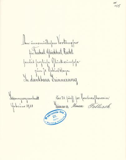 | Keywords: Goldenes Buch zum 70. Geburtstag August Bebel 1910 Seite 155.jpg Goldenes Buch zum 70 Geburtstag August Bebel 1910 Seite_ jpg 154 156 Glückwunschschreiben zum 70 Geburtstag von August Bebel SPD-Kreisorganisation des 21 Sächsischen Reichstagswahlkreises Johanngeorgenstadt August Bebel zum siebzigsten Geburtstag 22 Februar 1910 / mit einer Nachbemerkung von Ursula Herrmann Reprint des Unikats aus dem Zentralen Parteiarchiv der SED Dietz Verlag Berlin 1989 Lizenzausgabe Saur 1989 ISBN 3-598-07256-2 self scanned from own book 1910 Diverse Goldenes Buch zum 70 Geburtstag August Bebel 1910 PD-old-70-1923 |
