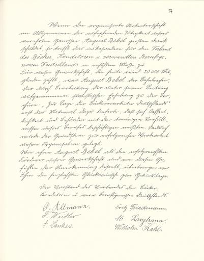 | Keywords: Goldenes Buch zum 70. Geburtstag August Bebel 1910 Seite 057.jpg Goldenes Buch zum 70 Geburtstag August Bebel 1910 Seite_ jpg 056 058 Glückwunschschreiben zum 70 Geburtstag von August Bebel Vorstand des Verbandes der Bäcker Konditoren und verwandten Berufsgenossen Deutschlands August Bebel zum siebzigsten Geburtstag 22 Februar 1910 / mit einer Nachbemerkung von Ursula Herrmann Reprint des Unikats aus dem Zentralen Parteiarchiv der SED Dietz Verlag Berlin 1989 Lizenzausgabe Saur 1989 ISBN 3-598-07256-2 self scanned from own book 1910 Diverse Goldenes Buch zum 70 Geburtstag August Bebel 1910 PD-old-70-1923 |