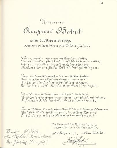 | Keywords: Goldenes Buch zum 70. Geburtstag August Bebel 1910 Seite 060.jpg Goldenes Buch zum 70 Geburtstag August Bebel 1910 Seite_ jpg 059 061 Glückwunschschreiben zum 70 Geburtstag von August Bebel Vorstand des Zentralvereins der Bildhauer Deutschlands August Bebel zum siebzigsten Geburtstag 22 Februar 1910 / mit einer Nachbemerkung von Ursula Herrmann Reprint des Unikats aus dem Zentralen Parteiarchiv der SED Dietz Verlag Berlin 1989 Lizenzausgabe Saur 1989 ISBN 3-598-07256-2 self scanned from own book 1910 Diverse Goldenes Buch zum 70 Geburtstag August Bebel 1910 PD-old-70-1923 |