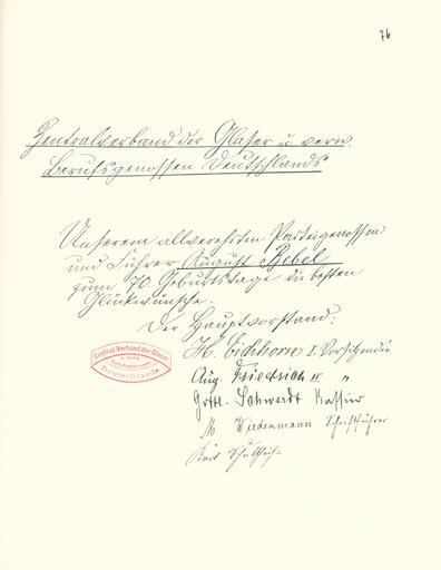 | Keywords: Goldenes Buch zum 70. Geburtstag August Bebel 1910 Seite 076.jpg Goldenes Buch zum 70 Geburtstag August Bebel 1910 Seite_ jpg 075 077 Glückwunschschreiben zum 70 Geburtstag von August Bebel Hauptvorstand des Central-Verbandes der Glaser und verwandter Berufsgenossen Deutschlands August Bebel zum siebzigsten Geburtstag 22 Februar 1910 / mit einer Nachbemerkung von Ursula Herrmann Reprint des Unikats aus dem Zentralen Parteiarchiv der SED Dietz Verlag Berlin 1989 Lizenzausgabe Saur 1989 ISBN 3-598-07256-2 self scanned from own book 1910 Diverse PD-old-70-1923 Goldenes Buch zum 70 Geburtstag August Bebel 1910 |