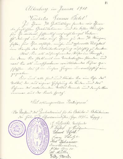 | Keywords: Goldenes Buch zum 70. Geburtstag August Bebel 1910 Seite 081.jpg Goldenes Buch zum 70 Geburtstag August Bebel 1910 Seite_ jpg 080 082 Glückwunschschreiben zum 70 Geburtstag von August Bebel Vorstand des Zentralvereins für die Arbeiter und Arbeiterinnen der Hut- und Filzwarenindustrie August Bebel zum siebzigsten Geburtstag 22 Februar 1910 / mit einer Nachbemerkung von Ursula Herrmann Reprint des Unikats aus dem Zentralen Parteiarchiv der SED Dietz Verlag Berlin 1989 Lizenzausgabe Saur 1989 ISBN 3-598-07256-2 self scanned from own book 1910 Diverse PD-old-70-1923 Goldenes Buch zum 70 Geburtstag August Bebel 1910 |