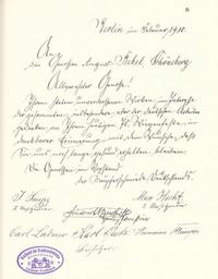 | Keywords: Goldenes Buch zum 70. Geburtstag August Bebel 1910 Seite 083.jpg Goldenes Buch zum 70 Geburtstag August Bebel 1910 Seite_ jpg 082 084 Glückwunschschreiben zum 70 Geburtstag von August Bebel Central-Vorstand des Verbandes der Kupferschmiede Deutschlands August Bebel zum siebzigsten Geburtstag 22 Februar 1910 / mit einer Nachbemerkung von Ursula Herrmann Reprint des Unikats aus dem Zentralen Parteiarchiv der SED Dietz Verlag Berlin 1989 Lizenzausgabe Saur 1989 ISBN 3-598-07256-2 self scanned from own book 1910 Diverse PD-old-70-1923 Goldenes Buch zum 70 Geburtstag August Bebel 1910 |