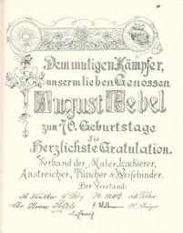 | Keywords: Goldenes Buch zum 70. Geburtstag August Bebel 1910 Seite 090.jpg Goldenes Buch zum 70 Geburtstag August Bebel 1910 Seite_ jpg 089 091 Glückwunschschreiben zum 70 Geburtstag von August Bebel Vorstand des Verbandes der Maler Lackiere Anstreicher Tüncher und Weissbinder August Bebel zum siebzigsten Geburtstag 22 Februar 1910 / mit einer Nachbemerkung von Ursula Herrmann Reprint des Unikats aus dem Zentralen Parteiarchiv der SED Dietz Verlag Berlin 1989 Lizenzausgabe Saur 1989 ISBN 3-598-07256-2 self scanned from own book 1910 Diverse PD-old-70-1923 Goldenes Buch zum 70 Geburtstag August Bebel 1910 |