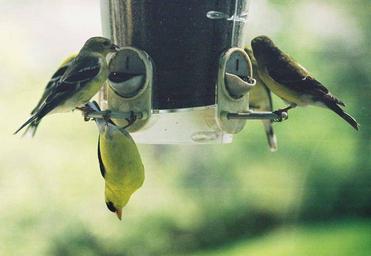 Keywords: GoldFinchHangingAround.jpg Male and Female American Gold Finches at a feeder Own 2007-07-08 Lsi john Bird feeding Spinus tristis