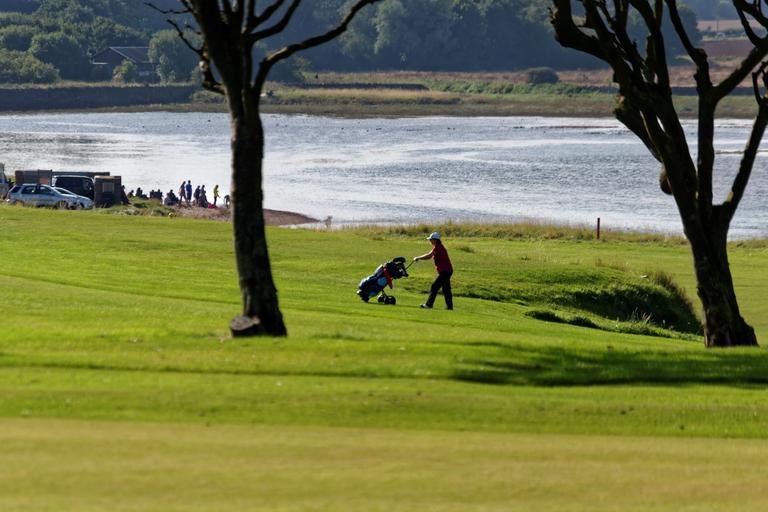 Keywords: golf course golf course golfer golf trolley walking landscape trees grass scenery green nature summer outdoor sun scenic natural green grass summer landscape water view shoreline person
