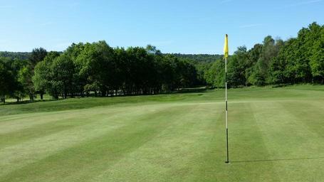 Keywords: golf golf course green grass landscape outdoor summer golfing fairway scenic golfer view tree flag sunny parkland