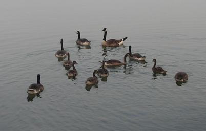 Keywords: Goose Creche full.JPG A Canada Goose Branta canadensis creche Own 2007-07-05 Scrumshus Branta canadensis swimming families