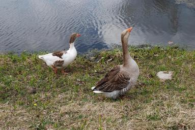 Keywords: goose two geese gross water outdoors farm brown white agriculture farming bird village meadow