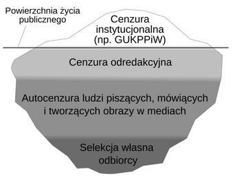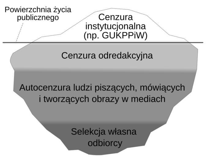 | Keywords: Góra lodowa cenzury.svg pl Góra lodowa cenzury Cenzura instytucjonalna jak np za czasów PRL jest tylko wierzchołkiem góry lodowej Pomiędzy taką instytucją a jednostkami cenzurowanymi występuje sprzężenie zwrotne które w rezultacie skutkuje wewnętrzną cenzurą redakcyjną nie wymagającą bezpośredniej interwencji instytucji nadrzędnej Kolejnym poziomem jest cenzura wewnętrzna samych autorów którzy wiedzą że o pewnych rzeczach nie należy pisać co w odpowiednich warunkach również działa automatycznie bez udziału instytucji nadrzędnej Ostatnim poziomem jest selekcja własna odbiorcy który przyjmuje tylko te wiadomości które są akceptowalne i zgodne z jego własnym światopoglądem Ponieważ światopogląd ten jest w pewien sposób ukształtowany przez powyżej wymienione stopnie cenzury to selekcja odbiorcy jest również rodzajem cenzury ponieważ może ona nie dopuścić do przyjęcia do wiadomości informacji niezgodnych z tak a nie inaczej kształtowanym światopoglądem co jest głównym zamierzeniem cenzury Tomasz Strzyżewski Matrix czy Prawda Selektywna Antycenzorskie retrospekcje Wrocław Wydawnictwo Wektory 2006 ISBN 83-922896-3-3 own own work by uploader Zureks Tomasz Strzyżewski 2009 Tomasz Strzyżewski |