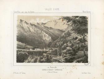 | Keywords: Gorge d'Escot-Sarrance et Tour de St. Nicolas - Fonds Ancely - B315556101 A ABADIE 3 027.jpg Page de titre lithographiée en camaieu qui représente l'auteur son carnet à dessin en main appuyé sur un rocher dessinée par H Landrin en 1852 9 lithographies en camaieu dessinées lithographiées d'après nature et signées par H Landrin - 1 carte in fine de la Vallée d'Aspe Cet ouvrage fait partie des Publications illustrées des Pyrénées publiées sous la direction de J Abadie Comme chacune d'entre elles il devrait comporter 10 lithographies mais aucun exemplaire n'est complet de toutes les lithographies voir J Labarère t I p 25 Recueil factice Cartonnage percaline noire nom du possesseur estampé en doré sur le plat supérieur Ch Dupouey Ex-dono ms p de titre hommage à Mr Charles Dupouey par Jh Abadie Ancely René 1876 - 1966 Possesseur Dupouey Charles Possesseur fre public domain domaine public B315556101_A_ABADIE_3_027 jpg image/jpeg 1 f de pl lithogr ; 4 30 5 cm Landrin Henri-Charles 1829-1898 Illustrateur Abadie Joseph-Bernard 1824-1876 Editeur Telmon Romain Théophile 1822-1890 Typographe http //numerique bibliotheque toulouse fr/collect/general/index/assoc//ark /74899/B315556101_A_ABADIE_3_027 dir/B315556101_A_ABADIE_3_027 jpg Bibliothèque municipale de Toulouse A-ABADIE 3-4 Creator Henri-Charles Landrin http //catalogues toulouse fr/web2/tramp2 exe/do_keyword_search/log_in setting_key BMT1 servers 1home query p000101 vignette http //numerique bibliotheque toulouse fr/collect/general/index/assoc//ark /74899/B315556101_A_ABADIE_3_027 dir/B315556101_A_ABADIE_3_027_thumb jpeg 1853 Gorge d'Escot-Sarrance et Tour de St Nicolas B315556101_A_ABADIE_3_027 lithography - print Henri-Charles Landrin Towers in art Historical images of Pyrénées-Atlantiques Canyons in France Mountains in art Vallée d'Aspe Streams Trees in art Landscape drawings Sarrance |