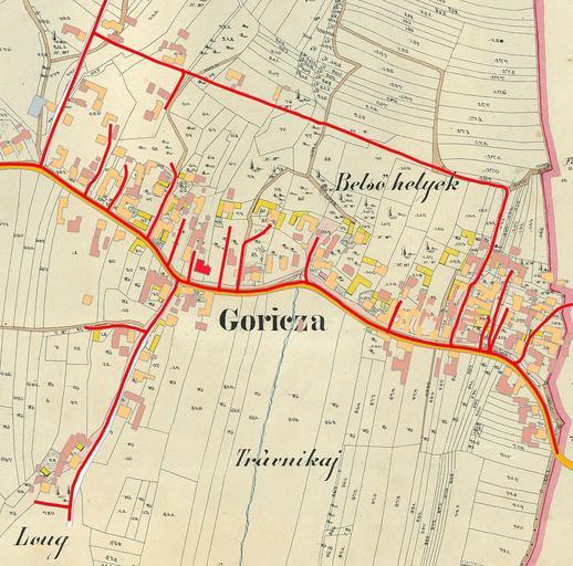 | Keywords: Gorica 1859 in sedanja karta v 180 in 1600.jpg Zemljevid Gorice 1859 Slovenija <br>Tako je izgledala Gorica pred 150 leti leto 2009 davnega leta 1859 bila je večinoma obdana z gozdom Slika je skenirana in ni cela - je samo izrez kjer so hiše Poslana mi je iz Geodetskega zavoda RS Legenda Njive Travniki Pašniki Listnate krošnje dreves pa nakazujejo redko poraslost z drevjem listavcev Stavba rdeče barve je bila edina v vasi zidana Ostale so bile lesene oddebeljena črta fasade pa naznačuje vhodno oz glavno stran poslopja Za oznako gozdov so povzeli staro srednjeveško klasifikacijo gozda na nizki srednji in visoki gozd zato so oznake gozda tudi MW Mittelwald ali HW Hochwald Ker legende ni si boste morali označen zemljevid razlagati po svoje Na moje vprašanje o legendi tega zemljevida pa sem dobil v Arhivu republike Slovenije naslednji odgovor Če pravilno razumem vaša vprašanja vas zanimajo legende na gradivu ki ga v Arhivu RS sploh nimamo zato bi bila razlaga zgolj ugibanje in morda celo strokovno sporno ravnanje V iskanju po internetu pa sem naletel na http //www posselt-landkarten de/zeichenerklaerung htm naslednjo stran ki je pa menda le podobna Fotografija skenirana in naložena Franc Lanjšček Zemljevid Gorice iz leta 1859 z hišami in njihovimi lastniki hišnimi številkami in parcelami - glej priloženi zemljevid wikitable Hišna številka Parcelna številka Lastnik hiše in parcele iz leta 1859 - 1 162 Bozsek Tresi - 2 159 Mörets Istvan - 3 150 Luthar Ferenez - 4 141 Luthar Ferenez - 5 145 Gutjmann Ignatz - 6 127 Mörets Josef - 7 122 Szeplits Mihael - 8 118 Verem Mathias - 9 113 Zseblek Miklos - 10 106 Kihar Janos - 11 101 Siftar Mihael - 12 93 Möretz Janosnö - 13 85 Katuna Janos - 14 80 Szecko Ivan - 15 73 Horvath Ivan - 16 38 Banfy Mihalynö - 17 39 Banfy Janos - 18 65 Slavits Mihalynö - 19 48 Gortsan Matyas - 20 41 Bürgemeister Leopold - 21 43 Domainko Lorencz - 22 31 Czelak Matyas - 23 15 Czelecz Janos - 24 26 Czelecz Janos - 25 5 Franko Matyas - 26 18 Mörecz Josef - 27 432 Kironos Istvan - 28 22 Občina Gorica - 29 35 Klobasa Lorentz - 30 97 Dietrich Leonard - 31 108 Vache Josef - 32 128 Verem Mathias - 33 50 Peschina Josef Uporaba tal na Gorici leta 1859 wikitable Vrsta Joch Klafter - Njive 358 136 - Travniki 123 804 - Vrtovi - 1263 - Sadovnjaki 4 681 - Pašniki 6 1184 - Visoki gozd - listavci 11 397 - Nizki gozd 15 1535 - Neuporabna tla 4 1033 - Reke in potoki 1 880 - Poti in krajevni prostor 8 147 - Zgradbe dvorišča in gradbišča 3 734 - Celotna površina 628 773 - 1 Joch Avstrija 0 5755 Hektar 1 Klafter Avstrija 1 8965 m Zapisano je da je Gorica dobila ime po »goricah« - vinogradih Za ta čas to ne drži saj kot je razvidno iz »Uporabe tal« teh sploh ni PD-old Gorica Puconci 19th-century maps of Slovenia |