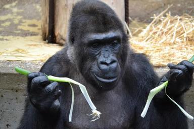 Keywords: gorilla ape primate wildlife nature portrait powerful strong head face looking eating playing animal
