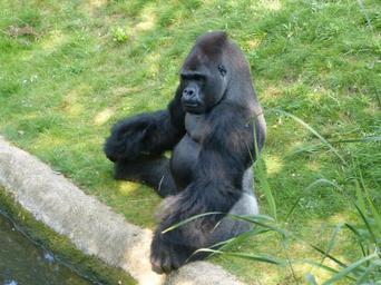 Keywords: gorilla monkey animal black zoo dominant imposing powerful large fur silverback wait