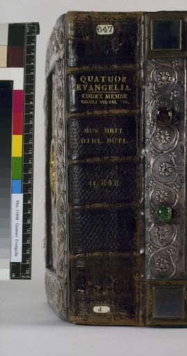 | Keywords: -Gospel book- - Spine (Add. ms 11848).jpg Style Panel design Religious miscellaneous Treasure binding; Caption Spine; Colour multi-coloured; Edge Unspecified exhibition history Decorative Technique Onlaid Jewelled Enamelled; Cover Material Wood Silver Metal Treasure binding;1st half of the 9th century; refurbished in 14th and 19th centuries Repoussé silver covers over wooden boards of Christ in Majesty on the upper cover and the Agnus Dei on the lower with foliate decoration and enamel bosses of the symbols of the Evangelists the eagle of St John and the ox of St Luke the two remaining symbols are missing in each corner of the upper cover probably a 14th-century Limoges addition Coloured stones were replaced in 1838 for Bishop Butler The clasps were also probably replaced 19th century Bone relics set within the oak boards of the cover; perhaps original object history Text c 820-c 830; Tours France; Unspecified object type Cc-zero place of creation Binding France place of discovery Unspecified British Library image http //www bl uk/catalogues/bookbindings/LargeImage aspx RecordId 020-000018404 ImageId ImageId 57073 Copyright BL Gospel book Uploaded with GWToolset Gospel book - Spine Add ms 11848 http //www webarchive org uk/bldatasets/bindings/add_ms_11848_fbspi jpg Bookbinding 9th-century bookbinding Gospel Book - BL Add11848 British Library Bookbindings |