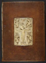 | Keywords: Gospels (the 'Cologne Gospels') - Upper Cover (Harley ms 2820).jpg Style Treasure binding; Caption Upper Cover; Colour Unspecified; Edge Gilt exhibition history Decorative Technique Unspecified; Cover Material Ivory British Museum/British Library in-house binding Rebound in 1977 Detached ivory panel of the Crucifixion with four symbols of the Evangelists and the Manus Dei from the original binding is mounted in a post-1600 British Museum binding of brown leather and stored separately object history Text 11c; Germany; Unspecified object type Cc-zero place of creation Binding England place of discovery Unspecified British Library image http //www bl uk/catalogues/bookbindings/LargeImage aspx RecordId 020-000018529 ImageId ImageId 57151 Copyright BL Gospels the 'Cologne Gospels' Uploaded with GWToolset Gospels the 'Cologne Gospels' - Upper Cover Harley ms 2820 http //www webarchive org uk/bldatasets/bindings/harley_ms_2820_fse010r jpg 11th-century bookbinding British Library Harley Manuscripts British Library Bookbindings |