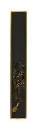 | Keywords: Gotô Ichijô - Kozuka with Kanzan and Jittoku - Walters 51686.jpg Kanzan Ch Hanshan Hanshan and Jittoku Ch Shide Shih Te are a pair of Zen eccentrics who lived at a monastery on Mt Tendai in China during the Tang T'ang period 618-907 They spoke to each other in a nonsense language that no one else understood Kanzan is always shown holding a scroll which he is explaining to Jittoku Jittoku carries a broom because he worked cleaning the monastery kitchen Kanzan stands in front with his scroll and Jittoku is behind holding a bucket His broom lays on the ground between 1824 1862 Edo-Meiji shakudo gold silver and copper cm 9 8 l accession number 51 686 6862 Henry Walters Baltimore date and mode of acquisition unknown Walters Art Museum Henry Walters Acquired by Henry Walters Signature Gotô Hôkyô Ichijô place of origin Edo present-day Tokyo Japan Walters Art Museum license Kozuka in the Walters Art Museum Gotô Ichijô Media contributed by the Walters Art Museum needs category review |