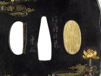 | Keywords: Gotô Ichijô - Tsuba with a Lotus Pond - Walters 51176 - Mark A.jpg This tsuba depicts a lotus pond with lotus flowers blossoming The plants are depicted in gold and silver relief On the back of the tsuba a water bug skims the water between the lotus The lotus is associated with Buddha and a state of purity The construction of this tsuba is unusual The front is made of a copper and gold alloy called shakudo while the back is silver They have been fused together creating a wavy pattern along the tsuba's edge between 1824 1862 late Edo silver shakudo gold copper at center cm 6 9 6 13 0 34 accession number 51 176 4515 Henry Walters Baltimore date and mode of acquisition unknown Walters Art Museum Henry Walters Acquired by Henry Walters Signature Goto Hokkyo/Ichijo kao place of origin Edo present-day Tokyo Japan Walters Art Museum license Tsuba in the Walters Art Museum Gotô Ichijô Media contributed by the Walters Art Museum needs category review |