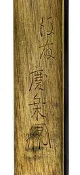 | Keywords: Gotô Keijô - Kozuka of a Bridge, Water-wheel and Castle Wall - Walters 51784 - Mark A.jpg This kozuka depicts a waterwheel in a river next to a castle wall On the right the castle fortifications jut into the river A bridge is at the left The reverse side of the kozuka is made of gold between 1651 1692 Edo shakudo gold cm 9 6 l accession number 51 784 39541 Henry Walters Baltimore date and mode of acquisition unknown Walters Art Museum Henry Walters Acquired by Henry Walters signature text place of origin Kyoto Japan Walters Art Museum license Kozuka in the Walters Art Museum Gotô Keijô Media contributed by the Walters Art Museum needs category review |