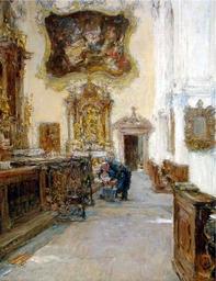 | Keywords: Gotthardt Kuehl Peterskirche Salzburg.jpg Inneres der Peterskirche in Salzburg Creator Gotthardt Kuehl 1912 Oil on canvas 70 x 90 cm WV-Nr 666 http //www auktionshaus-fine-art de/wordpress/2012/09/gemaelde-von-gotthardt-kuehl/ Other versions PD-old-auto-1923 1915 Gotthardt Kuehl 1912 paintings Paintings of church interiors Interior of the Stiftskirche St Peter Salzburg Swabbing | ||||