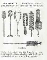 | Keywords: Goupillon epicier.jpg Goupillon Image provenant du Dictionnaire encyclopédique de l'épicerie et des industries annexes par Albert Seigneurie édité par L'Épicier en 1904 page 273 Goupillon Instrument compose généralement de gros fils de fer tordus garnis de crin et destine a nettoyer intérieurement divers objets principalement les bouteilles de toutes dimensions Bottle brushes and cleaning brushes of various designs Picture from Dictionnaire encyclopédique de l'épicerie et des industries annexes par Albert Seigneurie édité par L'Épicier en 1904 page 273 translation of information on source Brush Image from the Encyclopedic Dictionary of groceries and related industries by Albert Lord published by The Grocer in 1904 page 273 translation of text in image Brush Instrument usually consisting of a big piece of twisted iron and lined with horsehair intended to clean the inside of various objects mainly bottles of all sizes PD-old Cleaning equipment Images from Dictionnaire encyclopédique de l'épicerie et des industries annexes Brushes |
