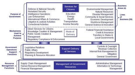 | Keywords: Government Business Reference Model.jpg Government Business Reference Model svg BUSINESS REFERENCE MODEL BRM The BRM provides a means to describe the business operations of the Federal Government independent of the agencies that perform them The model is the primary layer of the FEA and the foundation for the analysis of service components technology data and performance In the model of the BRM above four Business Areas separate Government operations into highlevel categories relating to the purpose of Government Services for Citizens the mechanisms the Government uses to achieve its purpose Mode of Delivery the support functions necessary to conduct Government operations Support Delivery of Services and the resource management functions that support all areas of the Government ™s business Management of Government Resources The model ™s four Business Areas are decomposed into 39 Lines of Business Each business line includes a collection of Sub-functions that represent the lowest level of granularity in the BRM For example the Environmental Management Line of Business encompasses three Subfunctions Environmental Monitoring and Forecasting; Environmental Remediation; and Pollution Prevention and Control http //www archives gov/records-mgmt/pdf/rm-profile pdf FEA Records Management Profile Version 1 0 2005-12-15 FEA Image BRM Overview jpg ; File Government Business Reference Model ja jpg PD-USGov Business reference models Federal Enterprise Architecture |