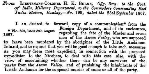 | Keywords: Govt of India - Assam Valley Incident Report.png en This is an official communication relating to the Assam Valley Incident that occurred in 1867 in the environs of Little Andaman Island India The authors died more than 70 years ago which makes it public domain under Indian law Selections from the Records of the Government of India Home Department No LXXVII Office of the Superintendent of Government Printing 1870 PD-old People of the Andaman and Nicobar Islands History of British India Assam |