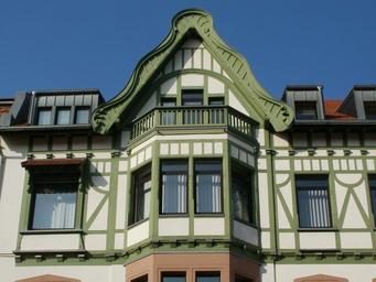 Keywords: graf johann straße saarbruecken architecture timber framing gable pediment bay oriel house front exterior