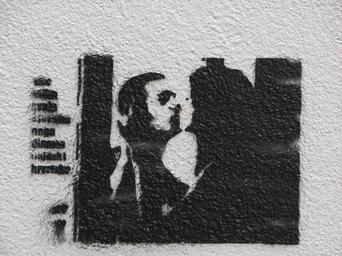 Keywords: graffiti black and white silhouette kiss couple wall stencil