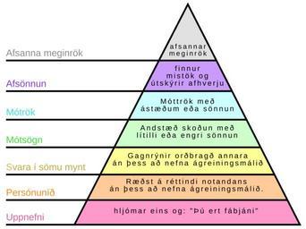 | Keywords: Graham's Hierarchy of Disagreement-is.svg A triangular graphic representing a hierarchy of disagreement from clear refutation to mere vituperation based on the essay http //www paulgraham com/disagree html How to Disagree by Paul Graham Graham's_Hierarchy_of_Disagreement svg 2011-03-25 00 38 UTC Graham's_Hierarchy_of_Disagreement svg Rocket000 derivative work Snaevar <span class signature-talk >talk</span> Other versions/Graham's Hierarchy of Disagreement translated to icelandic Snaevar Graham's_Hierarchy_of_Disagreement svg Snaevar Original upload log This image is a derivative work of the following images File Graham's_Hierarchy_of_Disagreement svg licensed with PD-user 2010-08-01T16 18 26Z LobStoR 707x530 2520 Bytes <nowiki>fix directional quotation mark in Name-calling text</nowiki> 2009-10-17T23 15 45Z DoriSmith 707x530 2518 Bytes <nowiki>Clean up typos in text </nowiki> 2009-03-04T06 05 43Z Arugula999 707x530 2638 Bytes <nowiki>no need for an +2kB inkscape edit just fix the typo in notepad this way it keeps it nice and clean for translations </nowiki> 2008-11-17T19 04 45Z Mfield 707x530 5202 Bytes <nowiki>Ad Hominem correct arguement -> argument</nowiki> 2008-09-05T08 23 47Z Rocket000 707x530 2594 Bytes <nowiki>different font less whitespace</nowiki> 2008-09-05T07 49 29Z Rocket000 730x530 2554 Bytes <nowiki> A triangular graphic representing a hierarchy of disagreement from clear refutation to mere vituperation hand-coded by uploader; based on Image Graham's Hierarchy of Disagreement jpg</nowiki> Uploaded with derivativeFX Argument maps Hierarchy Triangular diagrams Graham's Hierarchy of Disagreement |
