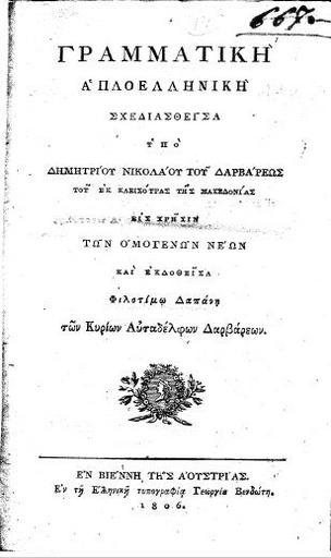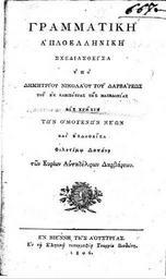 | Keywords: Gramatiki.Vardaris.jpg el Δημήτριος Δάρβαρης Γραμματική Α λοελληνική Εν Βιέννη της Αουστρίας 1806 ΦΣΑ 2491 Εξώφυλλο Κλεισούρα Καστοριάς en Diimíitrios N Darvari̱s Grammatiki Aploelli̱niki En Vienni̱ ti̱s Aoustrias 1806 FSA 2491 2011-09-19 http //anemi lib uoc gr/metadata/7/8/6/metadata-86-0000310 tkl Nikolaos Vardaris PD-old-100 Uploaded with UploadWizard Kleisoura Kastoria |