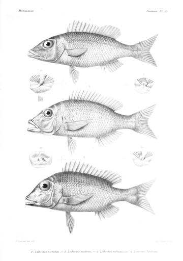 Keywords: GrandidierMadagascarFishes 0059.jpg Lethrinus microdon Lethrinus mashena Lethrinus mahsenoides Lethrinus latifrons Histoire Physique Naturelle et Politique de Madagascar Volume 16 Histoire Naturelle des Poissons atlas http //www archive org/details/histoirephysique16gran web 1885 text Alfred Grandidier 1836-1921 artists various Arnoul pd-old-70 Alfred Grandidier Histoire Physique Naturelle et Politique de Madagascar - Grandidier - Volume 16 Poissons |