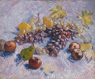 | Keywords: Grapes, Lemons, Pears, and Apples 1887 Vincent van Gogh.jpg Artwork Creator Vincent van Gogh oil canvas cm 73 92 1 Institution Art Institute of Chicago object history credit line http //www artic edu/aic/collections/artwork/14586 1887 PD-old-100 Other versions Still Life with Grapes apples lemons and pear by Vincent van Gogh |