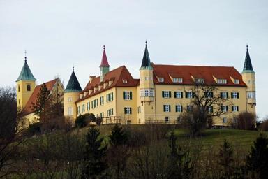 Keywords: grass austria castle palace architecture sky clouds mountains landmark historical nature outside countryside