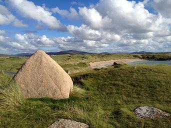 Keywords: grasslands meadows greenery stones rocks rocky structures hard solid mass matter landscapes blue water sky white fluffy clouds cloudy weather day scenic scenery nature outdoors ireland donegal