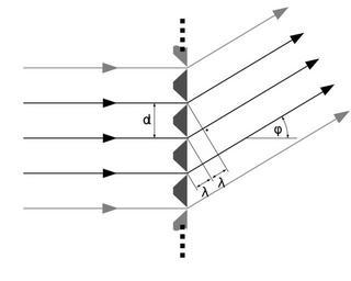 | Keywords: Grating condition.svg en Deriving the grating condition; at perpendicular incidence α+φ 90° inside the right-angled triangle the other angle is equal to 90°-α φ constructive interference occurs when sin φ is equal to the wavelength divided by the distance between the rulings or more generally when <math>\sin \varphi \dfrac n\lambda d n \in \Z </math> File Beugungsgitter sl svg File Beugungsgitter svg Pieter Kuiper Biezl 2012-03-22 Transmission gratings | ||||