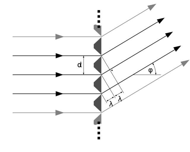 Keywords: Grating condition.svg en Deriving the grating condition; at perpendicular incidence α+φ 90° inside the right-angled triangle the other angle is equal to 90°-α φ constructive interference occurs when sin φ is equal to the wavelength divided by the distance between the rulings or more generally when <math>\sin \varphi \dfrac n\lambda d n \in \Z </math> File Beugungsgitter sl svg File Beugungsgitter svg Pieter Kuiper Biezl 2012-03-22 Transmission gratings |
