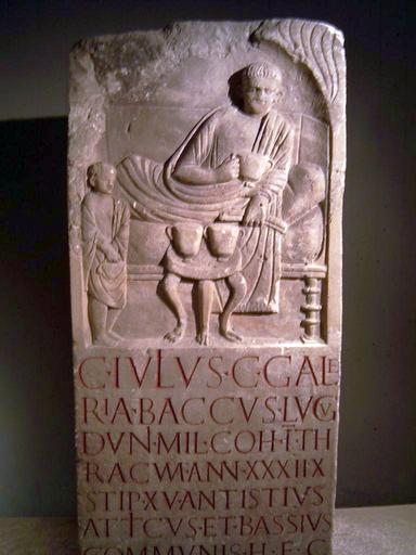 | Keywords: Grave relief of Iulius Baccus Römisch-Germanisches Museum Cologne.jpg Artwork Ucfirst Creator Anonymous Grabmal des Kohortensoldaten Caius Iulius Cai Galeria Baccus Julius Baccus war Soldat der ersten thrakischen Kohorte die im heutigen Bulgarien aufgestellt worden war Diese stand im 1 Jh nach Chr eine Zeitlang auch in Bonn Bonna late Other date century 1 limestone Institution Römisch-Germanisches Museum place of discovery Eigelstein 123 Cologne object history exhibition history credit line Caius IULIVS Cai GALE / RIA BACCVS LVGV / DVNI MILes COHortis I TH / RACVM ANNorum XXXIIX / STIPendiorum XV ANTISTIVS / ATTICVS ET BASSIVS / COMMVNIS Heredes Faciendum Curaverunt bottom la accession number Stein 24 place of creation Marcus Cyron Köln-römischer-Grabstein-FO-Eigelstein-123-Ende-1-Jh jpg CIL XIII 8318 - Römisch-Germanisches Museum Köln Cologne Germany jpg CIL XIII 8318 RSK 00270 IKoeln 00387 D 02569 Ancient Roman funerary steles in the Römisch-Germanisches Museum Cologne Baccus Images by Marcus Cyron 1st-century sculptures in Germany Ancient Roman reliefs in North Rhine-Westphalia Ancient Roman inscriptions in Römisch-Germanisches Museum Baccus CIL XIII 008318 |