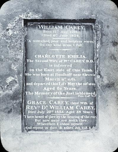 | Keywords: Grave of William Carey, India, ca. 1920 (IMP-CSCNWW33-OS15-65).jpg en <br> Grave of William Carey India ca 1920 Black and white lantern slide showing the grave of missionary William Carey 1761-1834 his second wife Charlotte Emelia Carey 1761-1821 and third wife Grace Carey d 1835 Reverend Dr William Carey founded the Baptist Missionary Society in 1792 and began its first mission to India in 1794 He worked in the Danish colony of Serampore and translated the Bible into Bengali Sanskrit and into regional Indian dialects Carey was buried in the Mission Burial Ground at Serampore After falling into disrepair the grave was renovated in 2009 This slide comes from a collection created by missionaries from Regions Beyond Missionary Union an interdenominational Protestant evangelical mission working in northeast India Bihar and Orissa and Nepal Photographer Unknown Subject personal name Carey William 1761-1834 ; Carey Charlotte Emilia 1761-1821 ; Carey Grace d 1835 Filename IMP-CSCNWW33-OS15-65 tif Coverage date 1915/1925 Subject unesco Missionary work Part of collection International Mission Photography Archive ca 1860-ca 1960 Part of subcollection Photographs from the Centre for the Study of World Christianity University of Edinburgh U K ca 1900-ca 1940s Repository name Centre for the Study of World Christianity Archival file Volume4/IMP-CSCNWW33-OS15-65 tif Repository address The University of Edinburgh School of Divinity New College Mound Place Edinburgh EH1 2LX United Kingdom Geographic subject country India Format aacr2 lantern slides 8 2 x 8 2cm Geographic subject continent Asia Rights Contact the repository for details Part of series Regions Beyond Missionary Union India mixed lantern slides CSCNWW33/OS15 Repository email divinity-CSWC ed ac uk Date created 1915/1925 Publisher of the digital version University of Southern California Libraries Subject aat genre exterior views Format aat lantern slides; photographs Geographic subject state West Bengal Access conditions http //www ed ac uk/schools-departments/divinity/research/centres/world-christianity/collections-resources Geographic subject cemeteries File CSCNWW33/OS15/65 Contributor Newton Co 37 King Street Covent Garden London Subject lcsh Missionaries; Burial; Cemeteries; Tombs 1915/1925 date created author http //digitallibrary usc edu/cdm/ref/collection/p15799coll123/id/78320 PD-old-70-1923 Magic lantern images Images from USC Digital Library uploaded by Fæ International Mission Photography Archive ca 1860-ca 1960 |