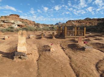 Keywords: grave yard cemetery old pioneer historic cowboys dirt sandstone spooky reverent quiet creepy sand worn erosion nature symbol brown orange yellow bluffs utah southern memorial tourism tour travel zions park haunted