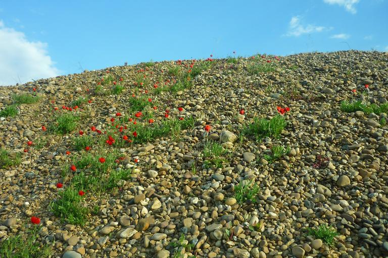 Keywords: gravel pit poppies red flowers stones collection spring sky life plants aggregates crisis