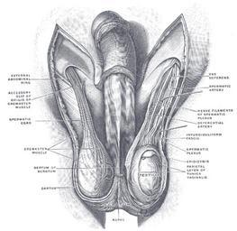| Keywords: Gray1144.png The scrotum The penis has been turned upward and the anterior wall of the scrotum has been removed On the right side the spermatic cord the infundibuliform fascia and the Cremaster muscle are displayed; on the left side the infundibuliform fascia has been divided by a longitudinal incision passing along the front of the cord and the testicle and a portion of the parietal layer of the tunica vaginalis has been removed to display the testicle and a portion of the head of the epididymis which are covered by the visceral layer of the tunica vaginalis Toldt Other fields 1 Information field Ucfirst Plate 1144 before 1858 Henry Gray Anatomy of the Human Body See Book section below 1144 Creator Henry Vandyke Carter Book Gray's Anatomy PD-old-100-1923 Gray's Anatomy plates 1144 Male genitalia diagrams Human testicles Groin |