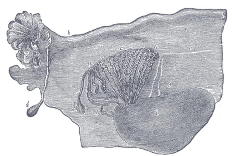 | Keywords: Gray1162.png Adult ovary epoöphoron and uterine tube From Farre after Kobelt a a Epoöphoron formed from the upper part of the Wolffian body b Remains of the uppermost tubes sometimes forming hydatids c Middle set of tubes d Some lower atrophied tubes e Atrophied remains of the Wolffian duct f The terminal bulb or hydatid h The uterine tube i Hydatid attached to the extremity l The ovary Other fields 1 Information field Ucfirst Plate 1162 before 1858 Henry Gray Anatomy of the Human Body See Book section below 1162 Creator Henry Vandyke Carter Book Gray's Anatomy PD-old-100-1923 Gray's Anatomy plates 1162 Human ovary |